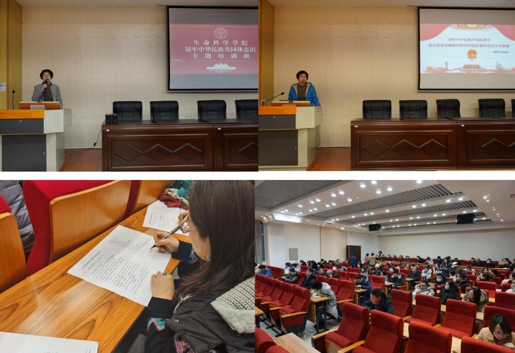 为了深入学习贯彻、全面准确领会习近平总书记关于民族工作、推广普及国家通用语言文字工作的重要论述,进一步提高政治站位,统一思想认识,太阳集团tyc539于2021年1月7日和8日上午9:00在生物楼229开展了铸牢中华民族共同体意识专题培训,本次培训由我院党委书记张慧荣主持,我院全体教师参加。1月7日上午,张慧荣书记以《国家统编教材使用和国家通用语言文字教育》为题,围绕“强化理论武装,打牢思想基础”、“坚持问题导向,坚...