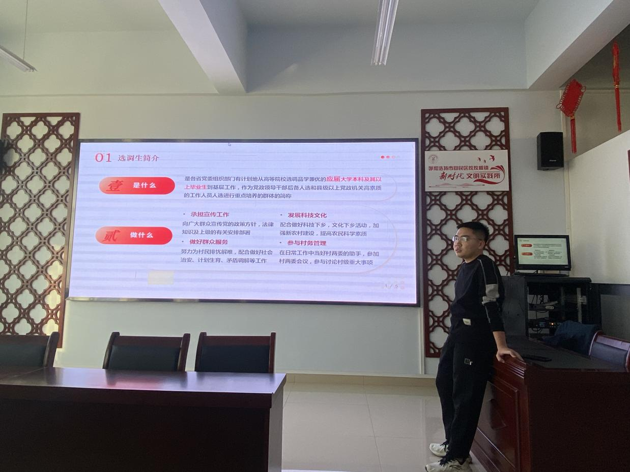 为了明确毕业生未来的就业方向和价值取向,太阳集团tyc539于2023年11月20日,由团委副书记管文荻、辅导员王予彤和冯昶瑞带领30名同学前往呼和浩特市回民区攸攸板镇人民政府开展选调生座谈分享会。此次分享会主要邀请2021年选调生敬佳琪和2022年选调生李雪为大家分享选调经验。座谈会上,敬佳琪和李雪结合自己的亲身经历,向大家详细介绍了选调生的报考条件、备考笔试和面试的经验以及选调生的分配方案、工作现状等方面的内容。会...