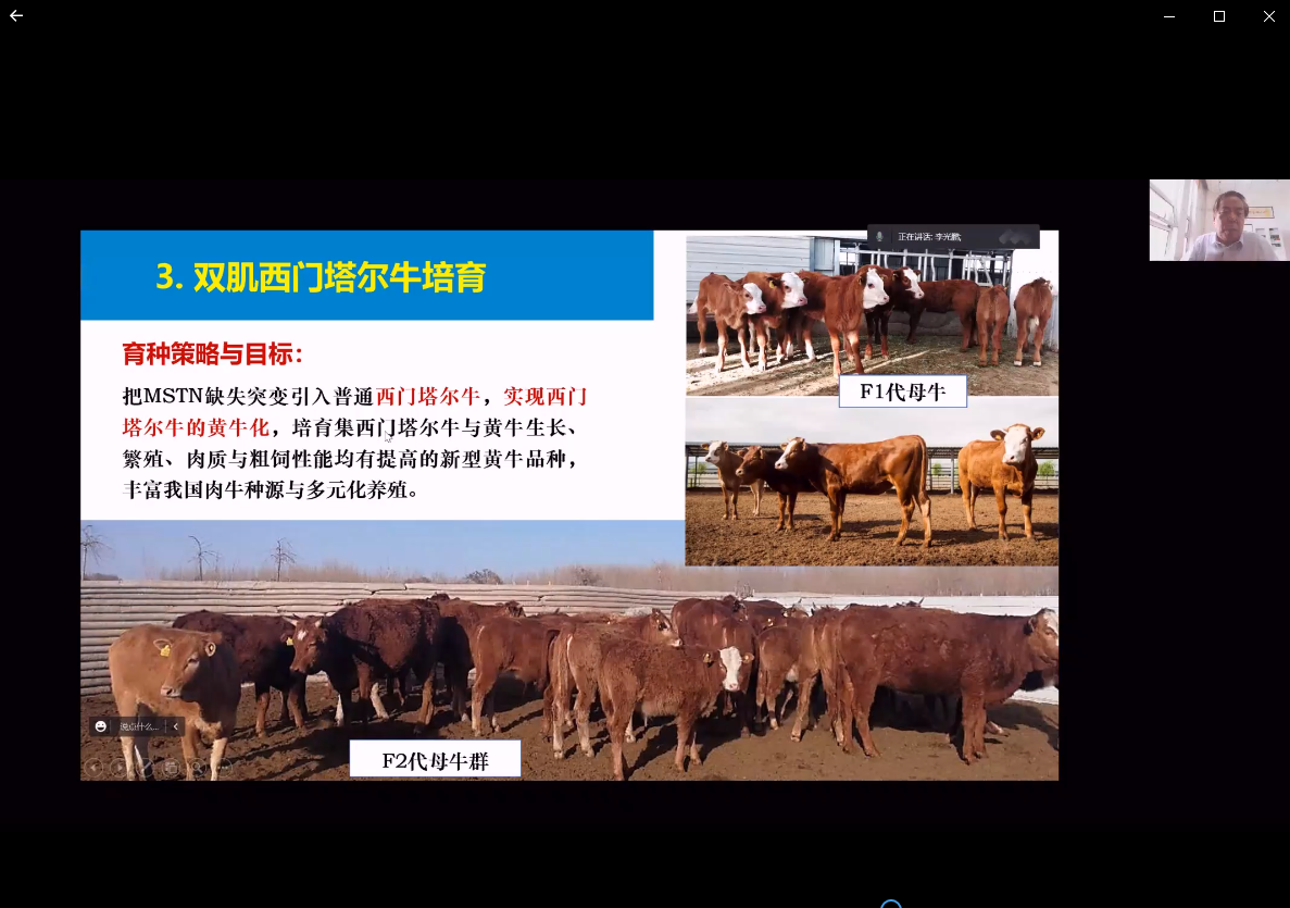 李光鹏教授现为太阳集团tyc539博士生导师,世界首例克隆骡子的创制者,成功培育出农业农村部认证的高产优质“双肌肉牛”三个新品系。李光鹏教授以“肉牛基因编辑育种研究”为题,介绍了内蒙古地区畜牧业发展资源优势、家畜生殖调控与繁育研究总技术路线以及生物技术育种的优势;重点介绍了MSTN基因编辑双肌牛新品系培育并解释了MSTN基因突变促进肌肉发育的生理与分子机制,李光鹏教授课题组培育的“双肌鲁西牛”、“双肌蒙古牛”、“双肌西门塔尔牛”为国际首次基因编辑技术培育成功的高产优质肉牛新品系,在我国黄牛育种史上具有里程碑意义;最后还介绍了基因编辑育种材料及其产品的生物安全以及动物生物育种技术发展趋势。