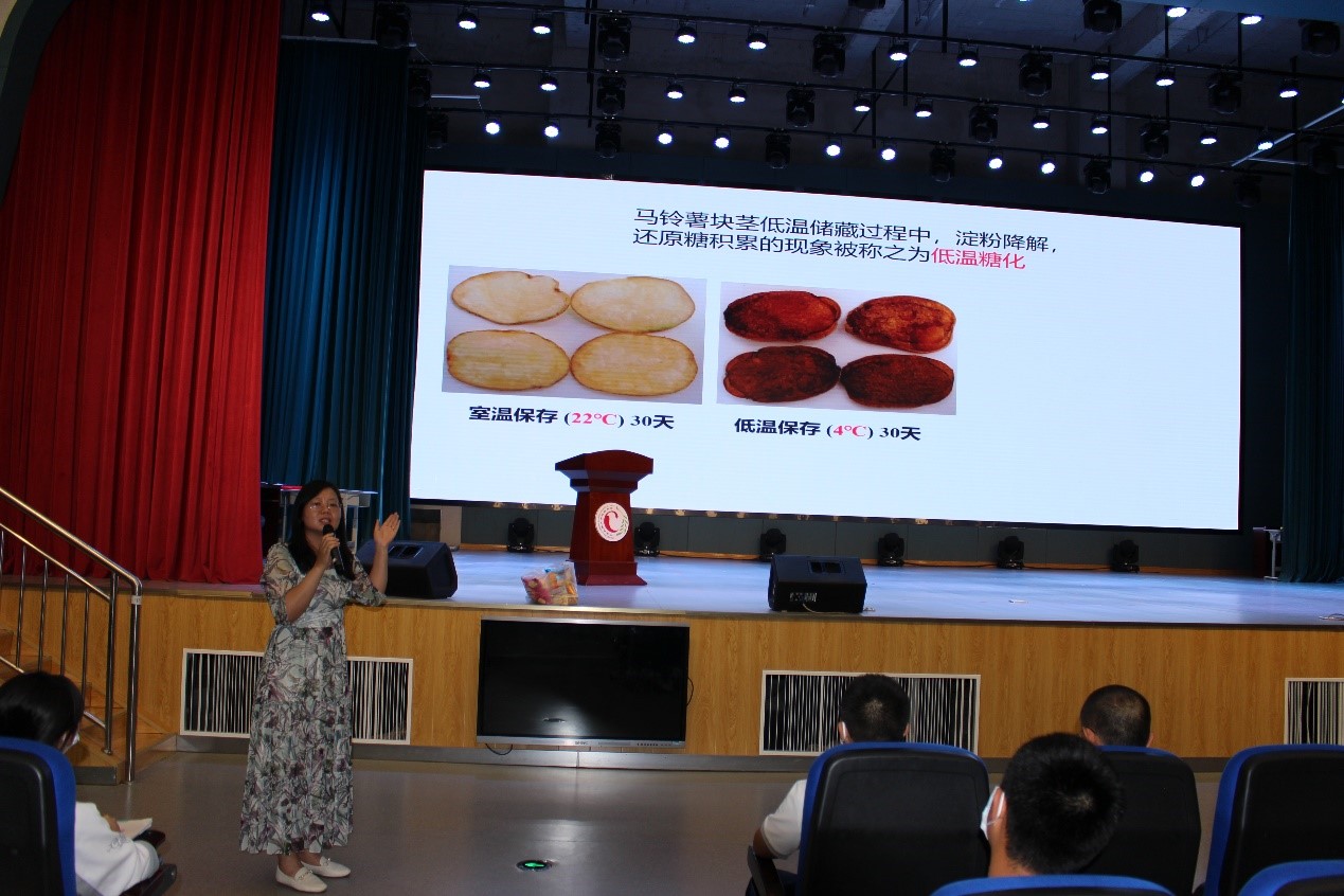 吴蕾副教授从同学们生活中常吃的薯片入题,讲解了如何利用分子生物学技术手段克服马铃薯低温贮藏中糖化反应影响薯片外观性状和质量的问题,深入浅出地介绍了CRISPR-Cas9技术编辑马铃薯中糖化反应关键VInv基因,从而解决薯片生产实际中遇到的难题。讲座过程中的互动环节同学们开动脑筋、发挥想象,积极回答问题,现场气氛非常热烈。