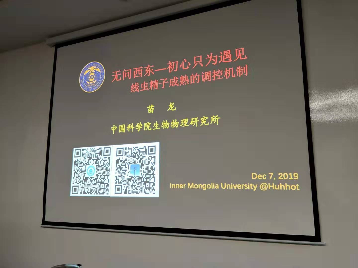 中国科学院生物物理所苗龙研究员于2019年12月7日上午在太阳集团tyc539做了题为“无问西东——初心只为遇见,线虫精子成熟的调控机制”的精彩报告。苗龙研究员用幽默简练的语言,深入浅出地介绍了线虫精子的成熟过程和其调控的分子机制,并与参加会议的师生进行了深入的讨论和广泛的互动。学术报告由我院莫日根院长主持,哈斯阿古拉教授、梁成光教授、那顺布和教授等老师和同学聆听了学术报告。