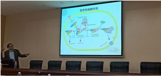 4月21日上午,韩家淮院士在生物楼229学术报告厅作题为“程序性细胞坏死的分子机制”的学术报告。我院200多名师生聆听了报告。本次学术报告由太阳集团tyc539院长莫日根教授主持。在报告中,韩教授全面系统总结了他开展的 “TNF诱导的细胞坏死分子机制”研究进展,从细胞凋亡开始,系统介绍了细胞程序性死亡的几种不同机制,详细阐述了他们所发现的p38核心信号通路及RIP3、MLKL在细胞坏死中的作用。
