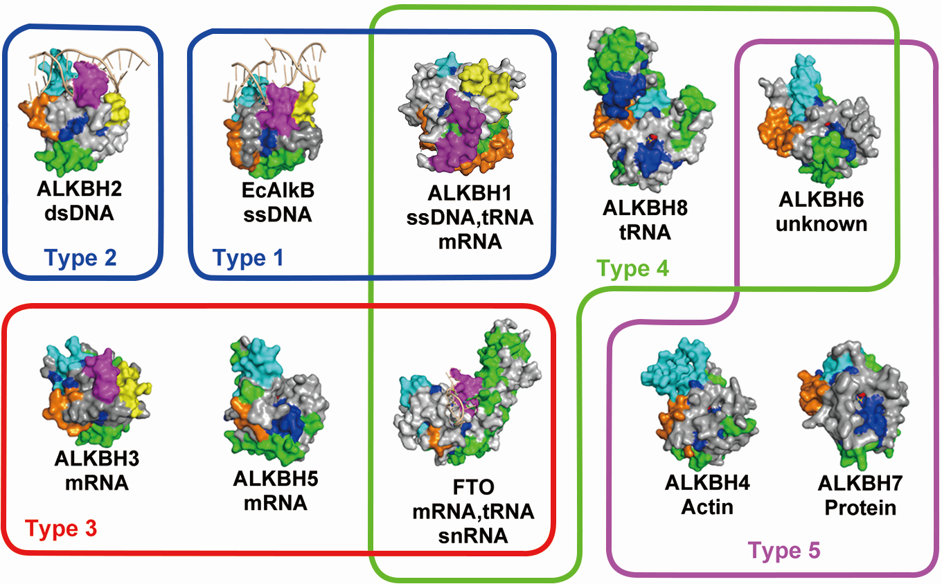 另外,小组成员们进一步开始研究具有与TET家族相同催化核心的ALKBH家族(RNA去甲基化酶)。与DNA去甲基化酶TET家族相比,ALKBH家族具有广泛的底物选择性包括DNA,RNA和蛋白质。研究人员发现九个ALKBH家族成员的催化结构域主要由四个关键loop组成,分别是L1、L2、L3、L4,详细描述了四个关键loop及非同源结构域与ALKBH底物选择性的关系。在此基础上,我们总结出了ALKBH的五种底物类型。AlkB含有四个关键loop,可通过挤压和翻转碱基的方式来修复损伤的DNA。 ALKBH2将其三个loop插入dsDNA中以辅助催化。ALKBH3、ALKBH5和FTO中的关键loop形成较窄的催化裂口,并倾向于结合单链核酸。ALKBH1、ALKBH8和FTO都具有非同源结构域,以帮助其结合具有特殊构象的核酸,例如tRNA和snRNA等。该成果2020年8月初在线发表在国际著名学术期刊Cellular and Molecular Life Sciences(2018 IF: 7.014),第一作者为我校太阳集团tyc5392016级生物工程专业本科生许宝芳。
