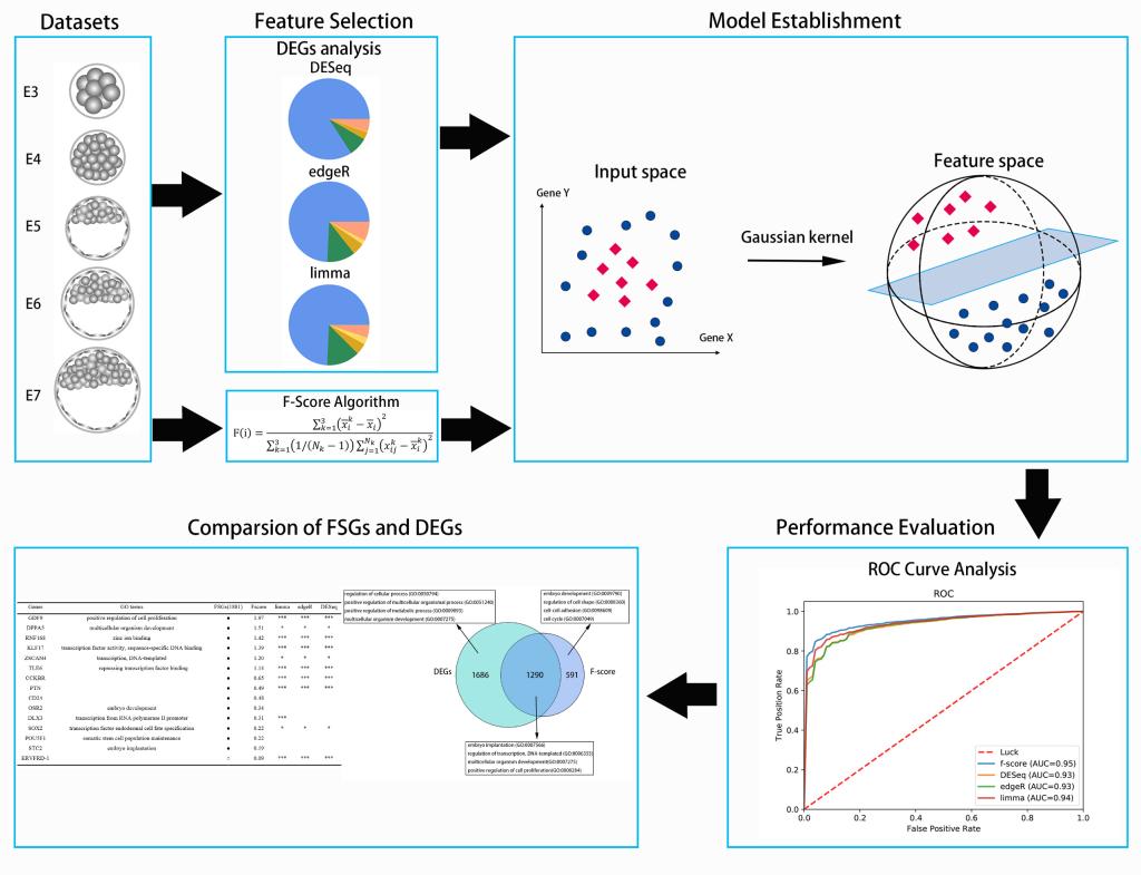 人类早期胚胎发育虽然只有大约7天的时间,但是却经历了关键的分子事件,其中包括合子基因组激活(ZGA)和早期胚胎细胞的命运决定。伴随测序技术的进步,单细胞测序技术可以有效地揭示早期胚胎发育的细胞命运决定的转录图谱,但是单细胞转录组数据也存在许多问题,例如dropout事件(表达的基因未被检测到),这使得差异分析方法在处理单细胞受到了限制。本研究中通过使用F-score算法和差异分析方法(limma,edgeR和DESeq)在人类早期胚胎单细胞转录组中得到两个关键的基因集。通过比较先前研究中关键的基因来分析两种方法的不同,POU5F1(OCT4)在细胞多能性的获得和维持中起到了重要的作用,但是在差异分析方法中却被排除,而F-score算法却可以获得。我们通过研究基因的表达趋势发现,差异分析方法对于在多个时期高表达的基因会被排除,这对于胚胎发育中的细胞的异质性是十分不利的。此外,我们使用人工智能方法来对两个基因集进行预测分类,结果表明使用F-score算法产生的基因集能够准确预测早期胚胎的发育阶段,并使用该分类器构建了第一个早期胚胎发育的预测网站(http://bioinfor.imu.edu.cn/empredictor/public/)。