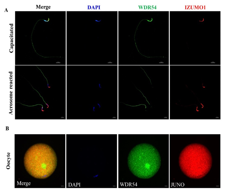 精子和卵母细胞膜的识别和融合对于哺乳动物的遗传和进化具有关键作用,这一过程需要精子和卵母细胞表面蛋白质之间的相互作用,特别是精子的IZUMO1与其卵子上的受体JUNO之间的相互作用。但异源表达IZUMO1和JUNO的体细胞混合实验显示,IZUMO1与JUNO的互相识别只能介导体细胞黏附,而并不能导致细胞膜融合,因此在受精过程中一定还有其它蛋白质协助IZUMO1和JUNO来完成膜融合。基于这一假说,邢万金和苏慧敏团队前期以IZUMO1和JUNO为诱饵,筛查小鼠睾丸和卵巢cDNA文库,发现一些可能与IZUMO1或/和JUNO结合的蛋白质。本研究选择WDR54为研究对象,用生物信息学方法和细胞分子生物学技术,确认了WDR54既能与IZUMO1结合,又能与JUNO结合,揭示了其在大鼠精子和卵子上的定位及与IZUMO1和JUNO的共定位,并发现抗WDR54抗体能显著抑制大鼠体外受精率,说明WDR54通过与IZUMO1和JUNO的相互作用参与精卵融合。这项研究首次发现既能与IZUMO1结合又能与JUNO结合,且影响精卵融合的蛋白,为解析哺乳动物精卵融合的分子机制提供了新的线索,打开了新的视野。该成果以“Participation of WD repeat containing protein 54 (WDR54) in rat sperm-oocyte fusion through interaction with both IZUMO1 and JUNO”为题发表在农林科学的Top期刊Theriogenology(中科院SCI二区)上(doi: 10.1016/j.theriogenology.2023.10.031)。该研究得到了国家自然科学基金(32060173,32260832)、内蒙古自然科学基金(2022MS03046,2020MS08098)、内蒙古自治区细胞分子调控重点实验室项目(2021PT0002)及本科大学生创新创业训练计划(202214303)的资助。太阳集团tyc5392019级博士研究生来兄为本文的第一作者,苏慧敏副教授和邢万金教授为共同通讯作者。