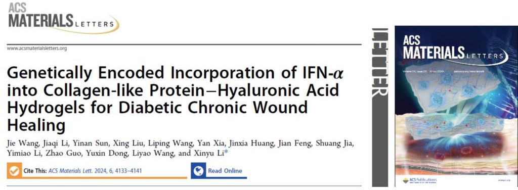 近日,我院李昕宇课题组在《ACS Materials Letters》(中科院一区,IF9.6)发表题为 “Genetically Encoded Incorporation of IFN-α into Collagen-like Protein–Hyaluronic Acid Hydrogels for Diabetic Chronic Wound Healing” 的研究论文,该论文以封面论文形式发表。