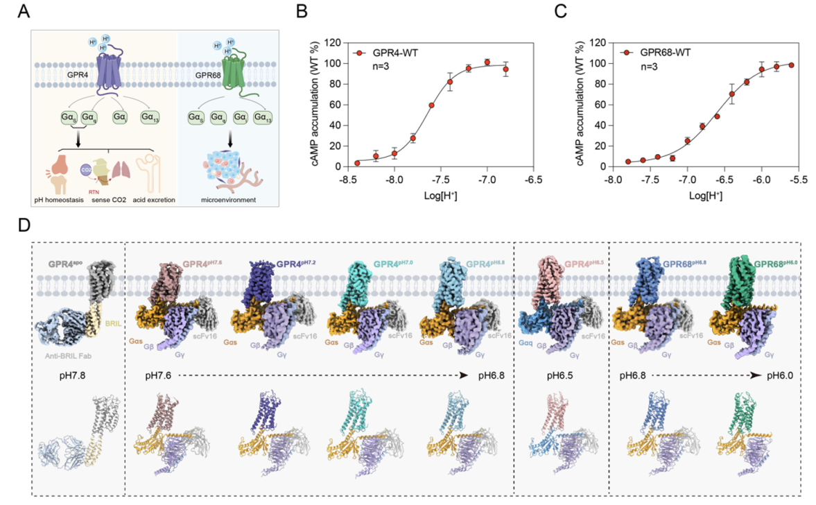 研究者首先利用生化及药理学方法不同pH 条件下对GPR4/GPR68的激活情况,发现GPR4的Gs 信号通路的最适激活pH为7.2-6.8, GPR68 的Gs信号通路的最适激活pH为6.0-5.6。在此基础上,研究者进一步解析了GPR4和GPR68在不同pH条件下与Gs或Gq三聚体高分辨率冷冻电镜结构(图 2)。