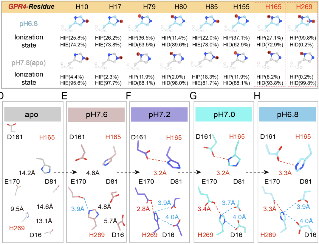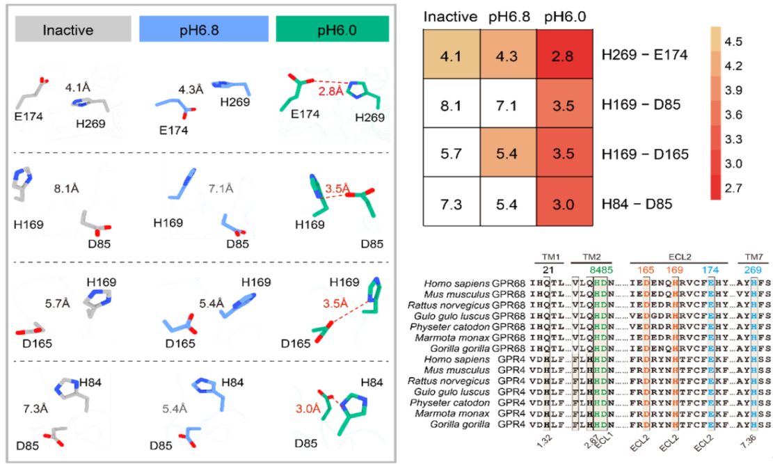 结合基于结构的pKa计算、pH依赖的活性测定、分子模拟以及突变功能分析,研究者首先发现两个保守的胞外组氨酸残基——位于ECL2的H165ECL2-45.47×47和TM6的H2697.36——在质子化后能够分别诱导与D161ECL2-45.43,E170ECL2-45.52等氨基酸的极性网络的形成,并驱动TM6与ECL2之间发生构象重排。这些变化构成了GPR4和GPR68质子诱导激活的核心共性机制。从原子分辨率水平明确揭示了这两个关键组氨酸残基在质子化状态下所引发的特异性构象改变及其在极性网络重构与受体激活中的关键作用(图3)。
