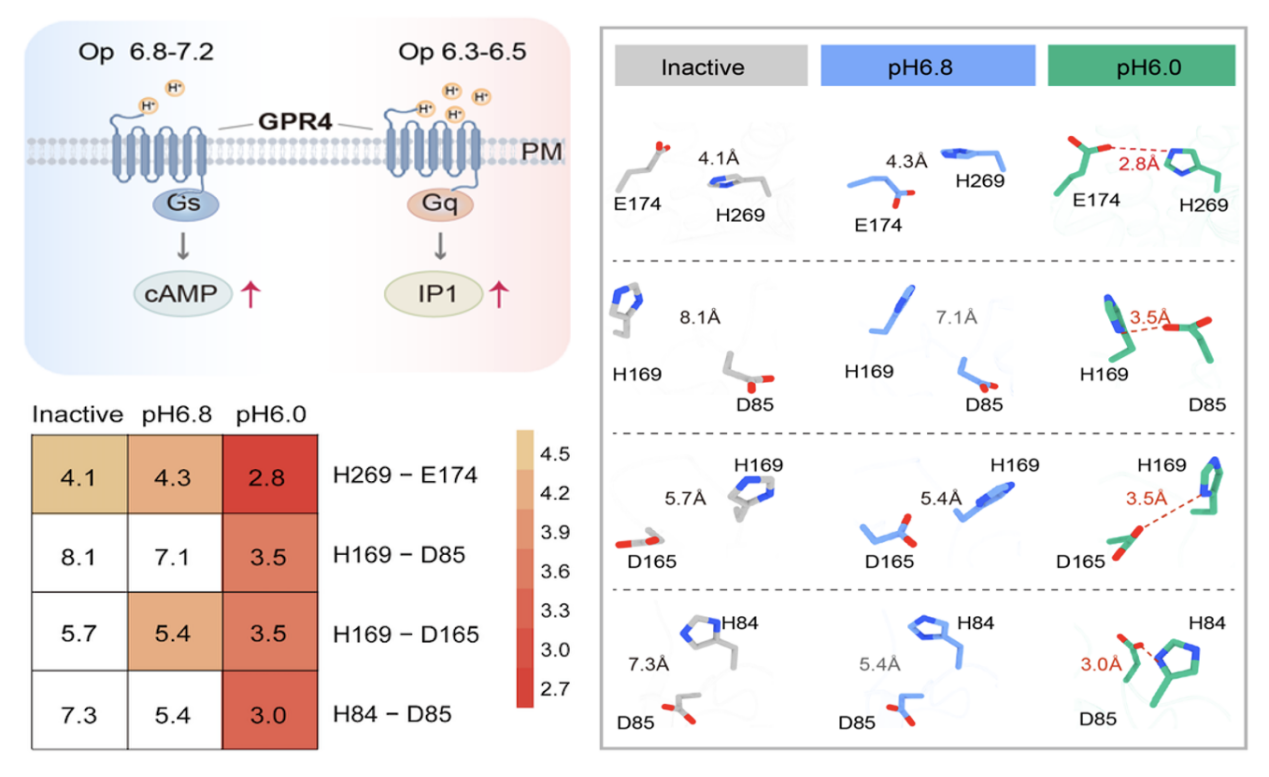 除此之外,研究者还发现不同组氨酸残基的质子化状态会引发GPR4与不同G蛋白亚型的选择性耦联。例如,H792.66的质子化专一性地促进GPR4与Gq的偶联,而对其与Gs的结合无显著影响。这一发现打破了传统对GPCR质子感知机制的认知,并揭示特定质子感知位点可能决定G蛋白亚型选择,从而影响下游信号的特异性功能输出(图5)。
