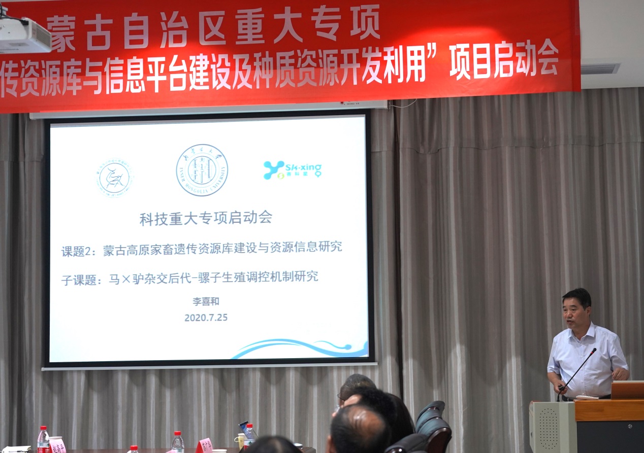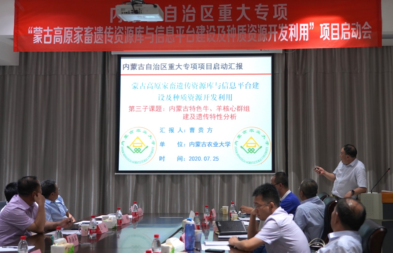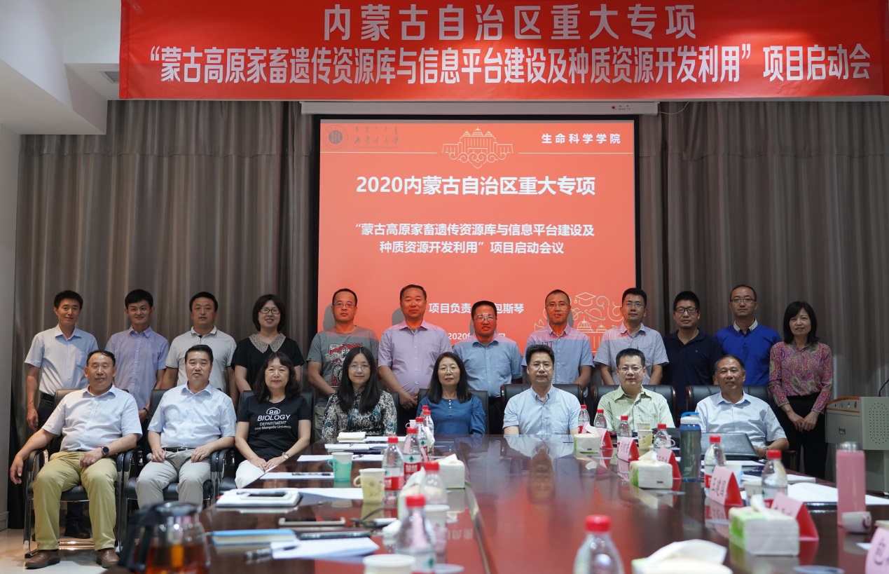 2020年7月25日,我校2020年获批的内蒙古自治区重大专项 “蒙古高原家畜遗传资源库与信息平台建设及种质资源开发利用”项目启动会在太阳成集团tyc539生命科学院召开。我校科技处副处长朱保华和生命科学院王潇教授出席开幕式并致辞,项目总负责人生命科学院包斯琴教授主持开幕式。子课题主持人生命科学院李喜和教授、生命科学院李雪玲教授、内蒙古农业大学曹贵方教授、内蒙古乐科生物技术有限公司项目负责人胡树香和内蒙古乐科生物技术有限公司项目负责人分别进行了专题报告。参加本次项目启动会的还有内蒙古自治区农牧业科学院王峰教授、内蒙古农业大学计算机学院院长高静教授、内蒙古农业大学兽医学院李海军教授、赛科星研究院育种中心主任孙伟、赛科星研究院实验基地主任赵高平和项目骨干成员,并分别作了专题报告。项目启动会针对研究工作中提到的遇到的关键问题、技术攻关和产业化应用等问题展开了深入热烈的讨论。