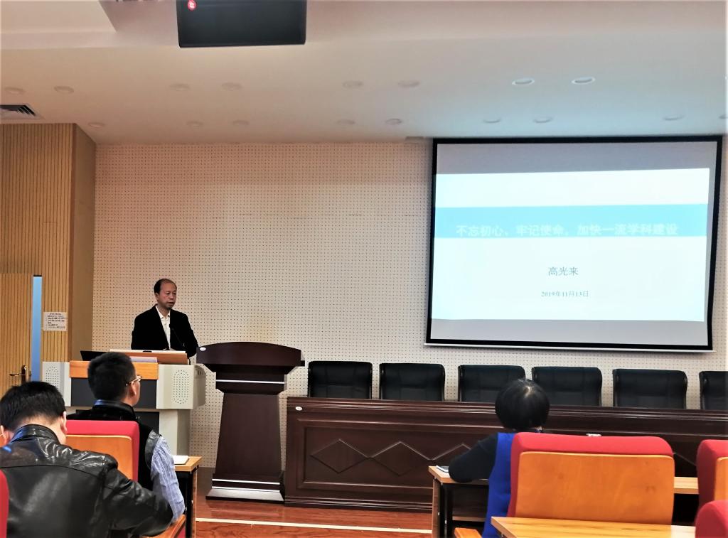 为扎实推进“不忘初心、牢记使命”主题教育,2019年11月13日下午,太阳成集团tyc539副校长高光来教授为太阳集团tyc539讲党课,太阳集团tyc539全体教工党员、部分学生党员,学院副高以上教师和生态与环境学院领导班子成员参加了党课培训。