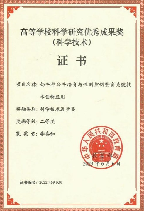 近日,教育部颁发了2022年度高等学校科学研究优秀成果奖(科学技术)获奖成果,我院李喜和教授团队牵头的“奶牛种公牛培育与性别控制繁育关键技术创新应用”获得了教育部高等学校科学研究优秀成果奖(科学技术)——科技进步二等奖。