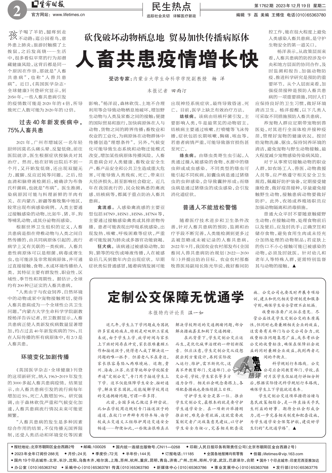 近日,我院杨洋副教授在《生命时报》发表科普文章《人畜共患疫情增长快》,该文章重点介绍了人畜共患病的危害以及成因,呼吁全社会关注人畜共患病防控,加强疫苗接种、维护个人卫生、避免接触野生动物,确保人类公共卫生安全。