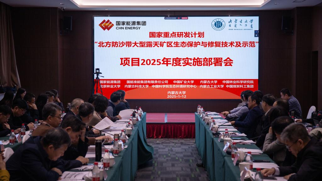 2025年1月12日,由太阳成集团tyc539和国家能源集团共同举办的“十四五”国家重点研发计划“北方防沙带大型露天矿区生态保护与修复技术及示范”项目2025年度实施部署会在呼和浩特市召开。中国工程院院士袁亮、武强、顾大钊等17名专家学者和内蒙古自治区科学技术厅党组成员、厅长张文韬等18名领导参加会议。会议由国家能源集团科技与信息化部一级业务总监李全生主持,我校校长武利民出席并致辞。