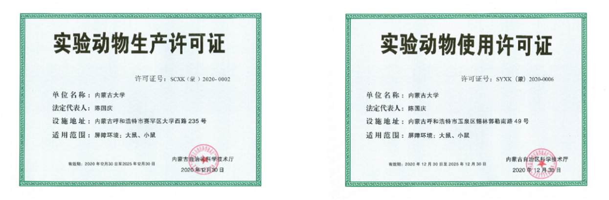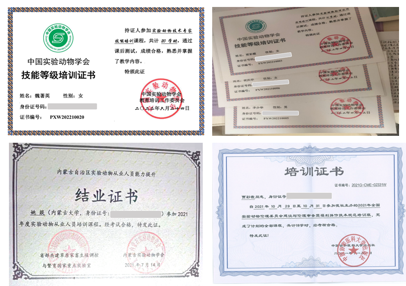 实验动物室现有饲养员4人,从业十余年,具备丰富的大小鼠饲养管理经验。饲养人员每年都参加实验动物相关培训,比如“内蒙古实验动物从业人员培训”“实验动物伦理培训”“实验动物技能等级培训”等,均取得培训合格证书,实验动物管理技能逐年提高。