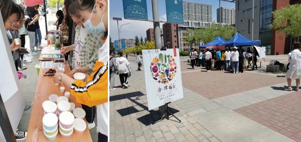 活动期间,该专业同学充当工作者为广大南校区师生提供黄瓜香蕉奶昔、槐花酸奶、芹菜番茄汁、手工枣糕等自制食品,使同学们真切了解食品的生产制作贮藏过程,并通过宣传栏、海报、专人讲解等形式向广大师生普及合理膳食知识,为关注健康的同学提供体脂测量,并做出定制化饮食建议。