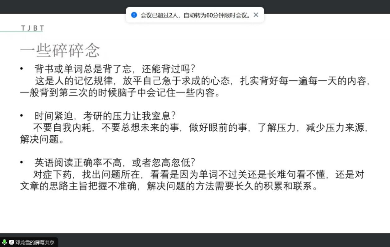 接下来由学姐邓龙雪结合自身备考经历为大家提供各个学科的学习方法以及遇到困难时的解决方法。政治科目上要二刷真题,查漏补缺,她认为每一遍刷题都能从中学到新的知识;对于数学科目,要回归课本知识点,进行错题的整理与回顾,做题不能追求数量而是要做优、做精;英语科目则要以单词为基础,多背单词。最后,学姐认为考研阶段要学会解决压力,不能急于求成,保持好的睡眠,要脚踏实地的学习。
