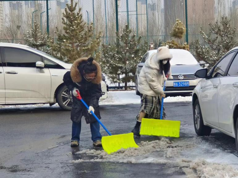 志愿者们领取工具后,立即有序地投入到扫雪工作中,分工明确,主要对生科楼周围道路进行了清理。寒冷的天气丝毫没有影响志愿者们的劳动热情,道路上的积雪因过往车辆碾压而紧紧附着在地面上,加剧了清扫的难度,同学们齐心协力、相互配合,认真清理责任区域内的积雪冻冰。