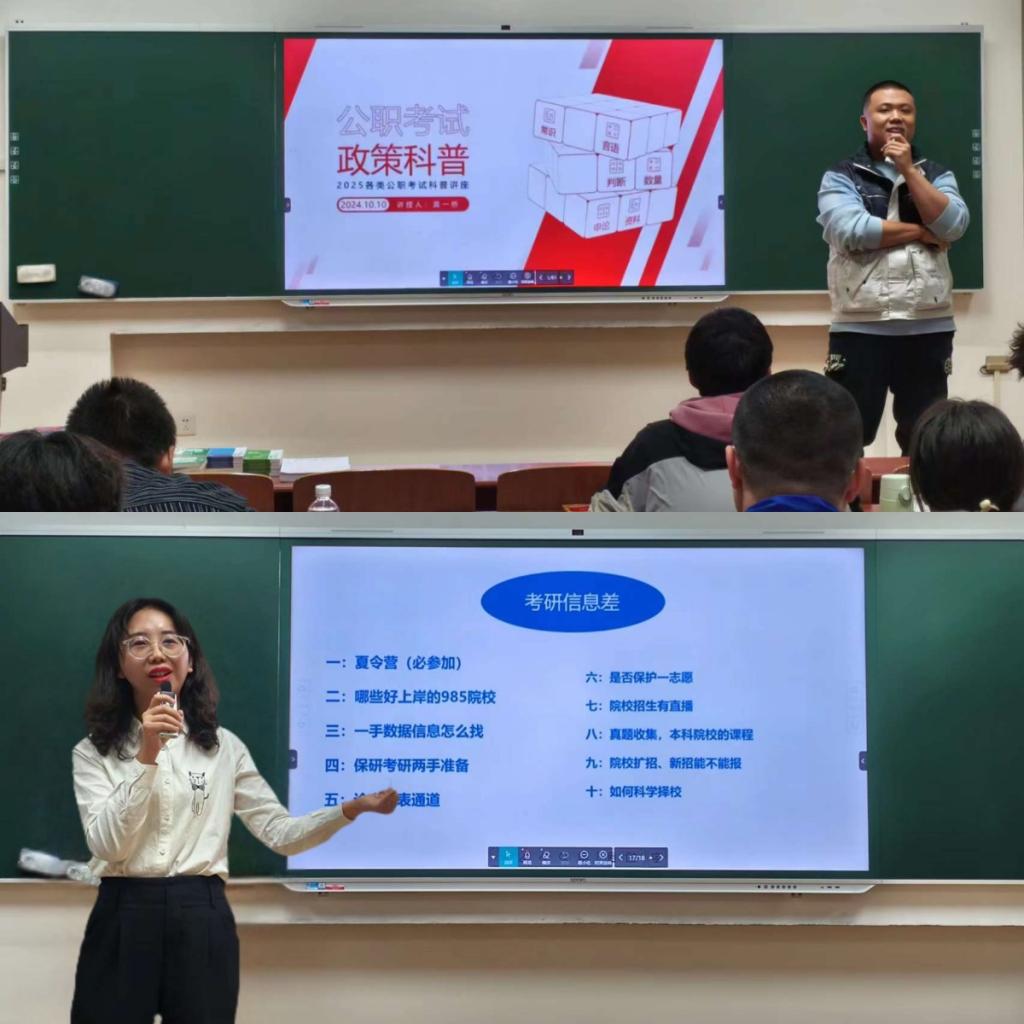 随后的现场互动环节中,同学们积极提问,老师们一一耐心解答,气氛热烈。许多学员表示,经过此次讲座,他们对研究生考试和公务员考试的整体框架有了更清晰的认识,备考信心也得到了提升。