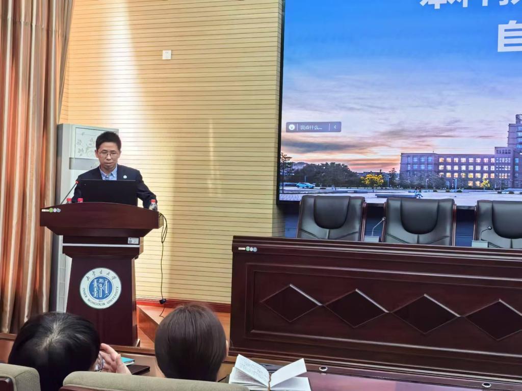 褚海斌副院长从本次本科教育教学审核评估工作的意义和作用,以及我校基本情况、评估工作开展情况、我校自评的结果等向为大家进行介绍。