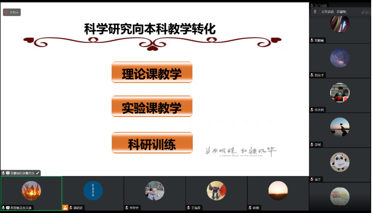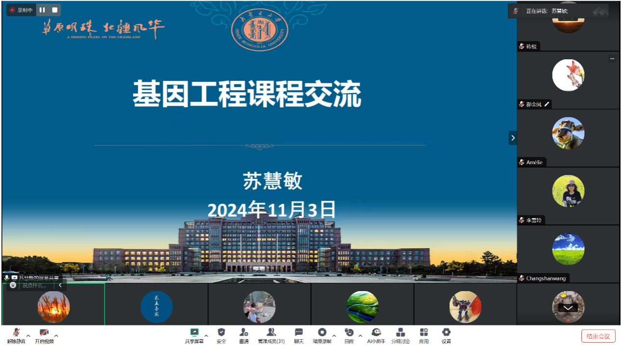 遗传与基因工程教研室和细胞生物学教研室联合举办了线上教学交流研讨会,来自两个教研室的32名教师参与了本次研讨会。会上,内蒙古自治区高等教育教学成果奖、内蒙古自治区五一劳动奖章获得者苏慧敏副教授从课程定位和课程目标、课程思政、教学内容和课程设计、教学模式、教学方法和手段、课程评价几个方面分享了主讲课程《基因工程》的整体设计和课程教学中的宝贵经验,特别是对理学类专业课程的思政教学做出透彻解析,介绍了多种教学手段和方法的应用、教师科学研究向本科教学转化的方式方法,为参会教师提供了丰富的参考,也为教师们改进教学设计,提升教学质量提供了宝贵的思路。